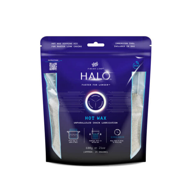 HALO® HOT WAX chain lubricant is engineered to dramatically improve drivetrain performance over long relubrication intervals by reducing friction and wear caused by abrasive contaminants. Developed in a laboratory with state-of-the-art chemistries and field tested by leading professional teams, it excels in all riding conditions. HALO® HOT WAX is dry-to-the-touch on the chain for maximum cleanliness and delivers advanced water and rust resistance. HALO® HOT WAX bags are specifically designed to be boiled in water to melt the wax pellets inside. The bag is reusable and contains enough wax pellets (600g) for approximately 25 chain dips. All bags include an Immersion Tool inside to make the chain dipping process easy.