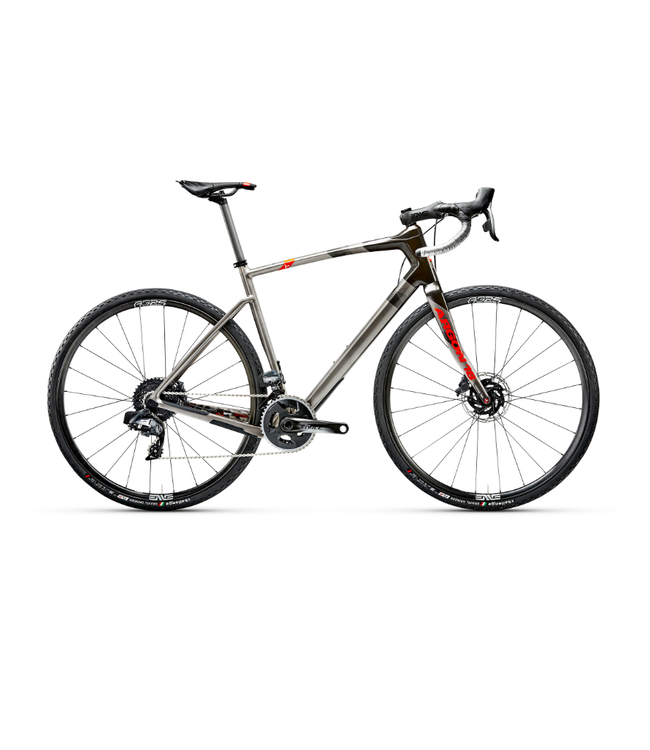 Cadre avec géométrie Gravel de carbone et composantes Sram Rival E-tap électroniques avec freins à disque hydrauliques.