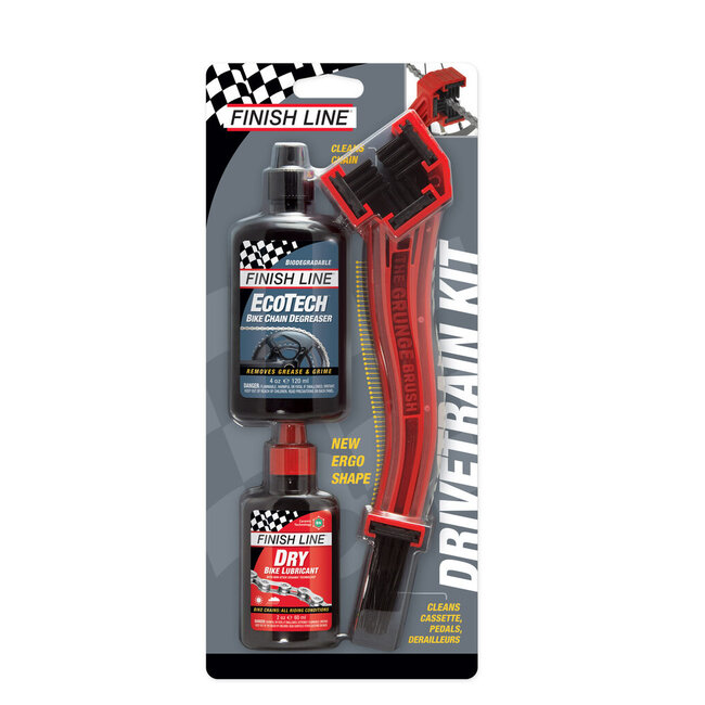 Le kit Finish Line® Drivetrain vous apporte trois de nos produits les plus populaires dans un kit de nettoyage pratique : La Grunge Brush™, le dégraissant EcoTech™ et le lubrifiant sec.